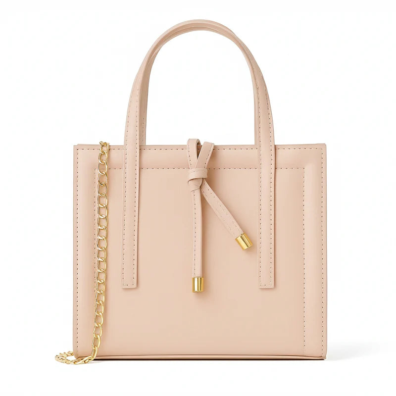 Carry it by the sleek top handles for a polished look or attach the gold chain strap for hands-free convenience. Its compact form is thoughtfully designed to hold your essentials without compromising on style.