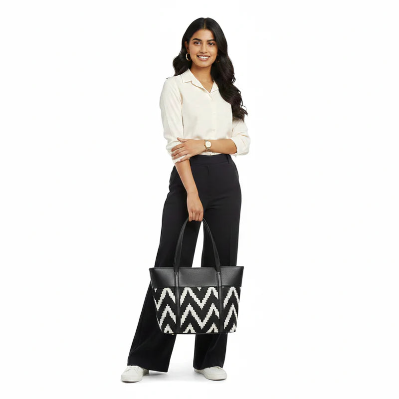The Royal Carry Obsidian Linea is a refined statement piece crafted for women who appreciate bold design with a modern edge. Featuring a striking black-and-ivory geometric pattern, this bag delivers a powerful yet elegant aesthetic. The structured silhouette, paired with long reinforced handles, ensures both comfort and durability for everyday use. Whether styled for work, travel, or city outings, Obsidian Linea adds a confident, premium touch to your look.